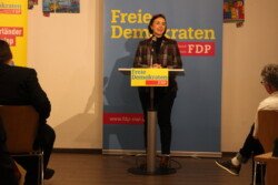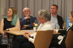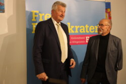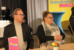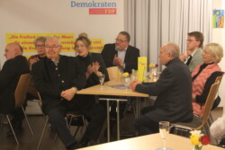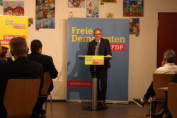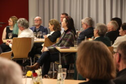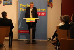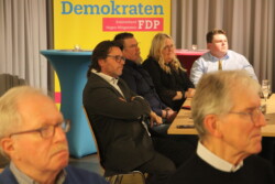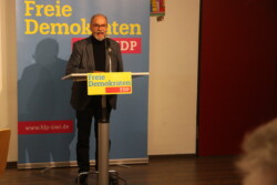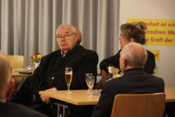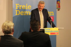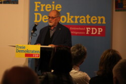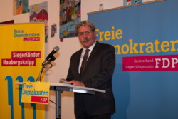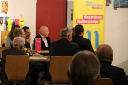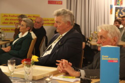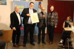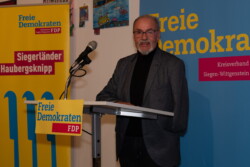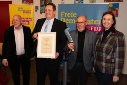 Mit Wolfgang Könen wurde ein kommunales Urgestein neuer Preisträger. Guido Müller lobte ihn als das Musterbeispiel eines Volkspolitikers. „Wenn es ein Problem in Trupbach und Seelbach gibt, dann ist es Wolfgang, der angesprochen und um Hilfe gebeten wird. Und er ist hartnäckig genug, das Problem auch zu lösen“, meint auch Laudatorin Angela Freimuth MdL, die darauf eingeht und augenzwinkernd von so manchem Gespräch berichtet, „wenn das Land helfen soll“. Die Stellvertretende Fraktionsvorsitzende der FDP Landtagsfraktion, kennt Könen seit Jahrzehnten und würzte ihre Laudatio daher auch mit solchen „persönlichen Anekdötchen“. Dabei betonte die Südwestfälische Abgeordnete insbesondere das bemerkenswerte sportliche Engagement von Wolfgang Könen. Ob als aktiver Sportler oder eben als Sportsfunktionär ist Wolfgang Könen über Jahrzehnte in Erscheinung getreten. Denn auch jetzt mit 81 Jahren ist das „kommunale Urgestein“ als stellvertretender Fraktionsvorsitzender im Rat der Stadt Siegen vor allem auf die Themen Sport und Ehrenamt spezialisiert. Sein Dank ging an seine Familie, die ihm für alle diese Aktivitäten stets den Rücken freihielt und sein Engagement unterstützte. Das politische Ehrenamt liegt bei ihm in der Familie. Seine Mutter war die Siegener Bürgermeisterin Hilde Fiedler. Mit der FDP entschied sich Wolfgang Könen dann aber für den freiheitlichen Mitbewerber unter den Parteien.